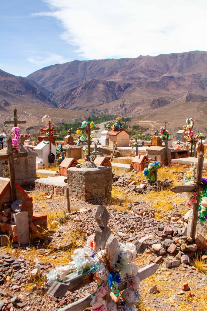El color en las tumbas del noroeste refleja una relación con la muerte que tiene raíces tanto en la tradición católica popular como en la cosmovisión andina. Los muertos no están separados de la vida cotidiana sino presentes, visitados cotidianamente, y cuidados. El cementerio de Huacalera, como todos los del norte, es un lugar que se cuida.