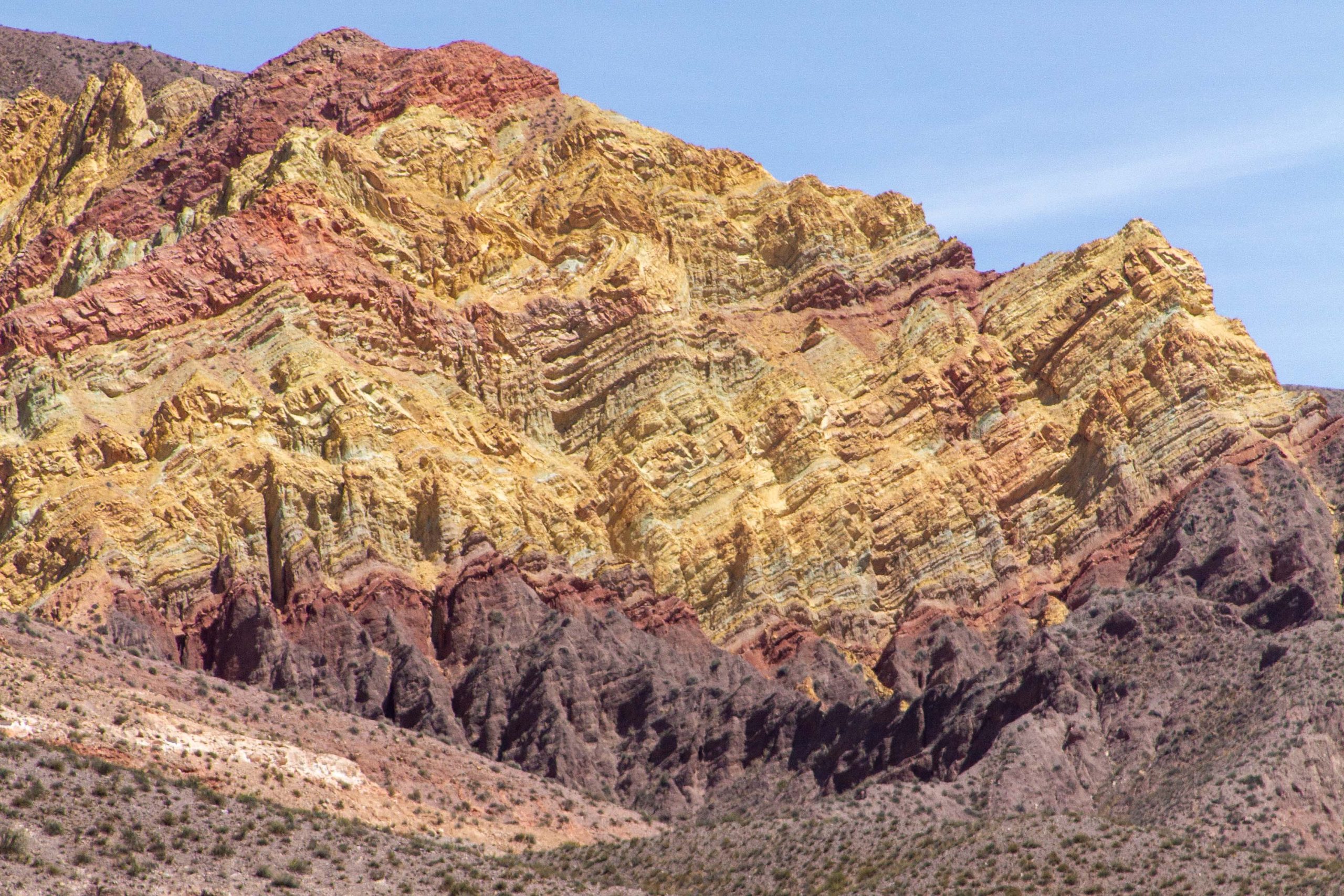 Lo que hace especial a las formaciones cerca de Huacalera es la combinación de colores en una escala manejable, no la pared monumental del Hornocal, sino afloramientos a ras del suelo, accesibles, donde uno puede acercarse y ver la textura de la roca, las vetas de colores que atraviesan los estratos en diagonal. Paisajes que no requiere ningún conocimiento previo para resultar fascinante.