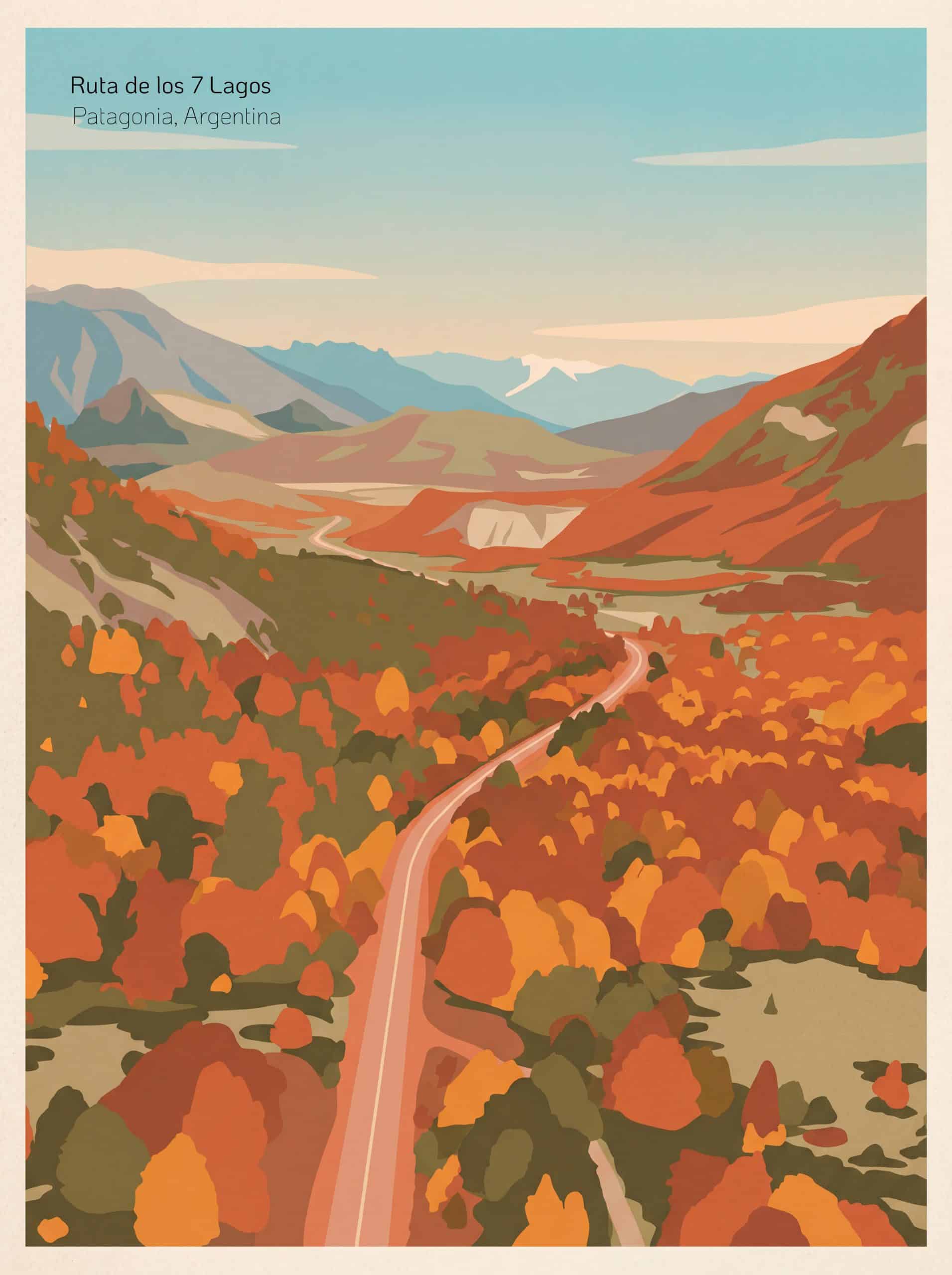 El otoño en la ruta de los 7 lagos en toda su expresión. Todos los posters están diseñados junto a Gustavo Arias tomando algunas de sus fotografías más icónicas de cada destino para convertirlas en estos hermosos posters.