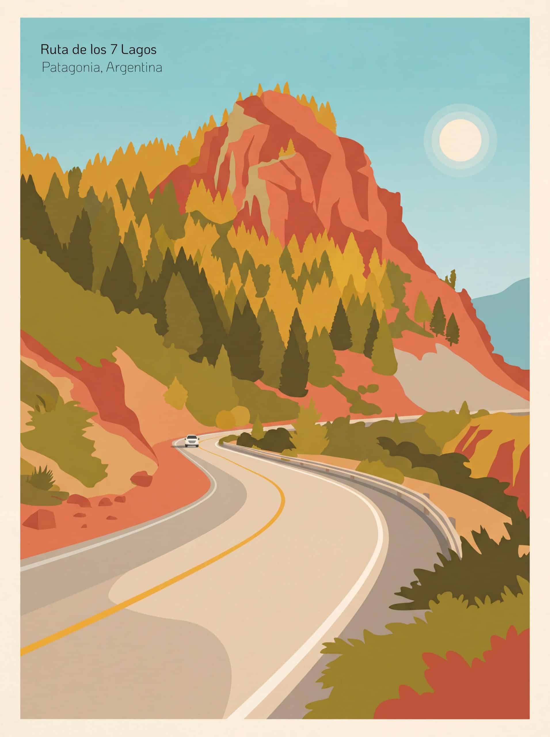 Una de las curvas más espectaculares de la Ruta de los 7 Lagos. Todos los posters están diseñados junto a Gustavo Arias tomando algunas de sus fotografías más icónicas de cada destino para convertirlas en estos hermosos posters.